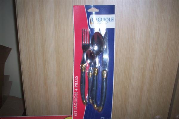 Besteksets = mes, vork, soep- en koffielepel. Gekende merk Laguiole. kleur groen. Er zijn 6 sets dus een totaal van 24 stuks. Nieuw, nog in de verpakking. Verzending voor de koper.