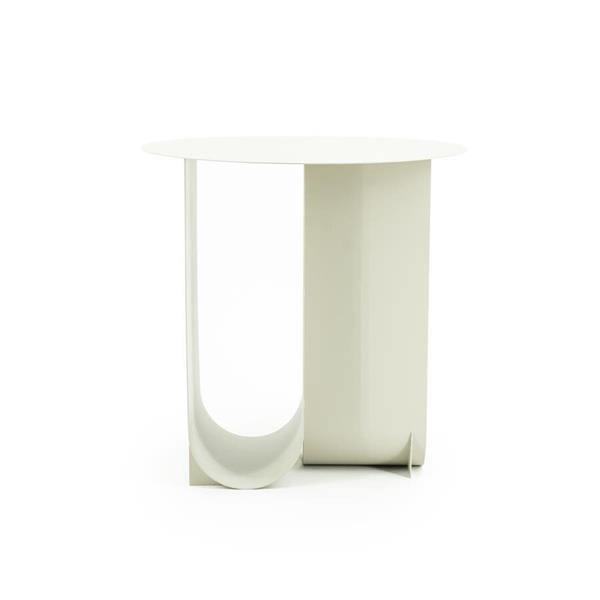 De tafel heeft een uniek asymmetrisch ontwerp met een ronde top en een opvallende basis die bestaat uit twee verticale panelen – een rechthoekige en een met een U-vormige uitsparing. Dit geeft een artistiek en architectonisch element aan je interieur.