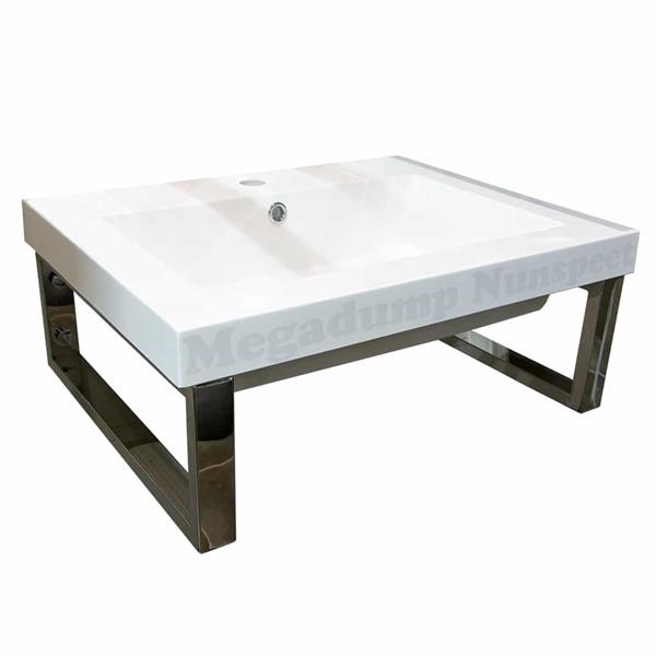 Massief mineraal marmeren wastafel op gepolijst RVS ophangbeugels ter ondersteuning van het wastafel.