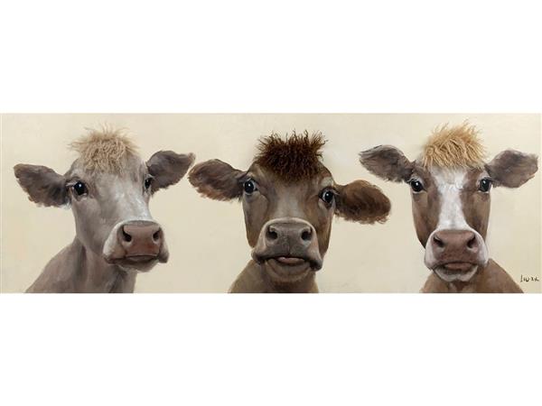 De maat van het Olieverf schilderij koeien van Ter Halle is 150 x 50 cm. Afgebeeld zijn koeien met echt haar (wol)