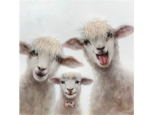 De maat van het Olieverf schilderij schapen van Ter Halle is 80 x 80 cm. Afgebeeld zijn schapen waar van de kuifjes gemaakt zijn van wol.