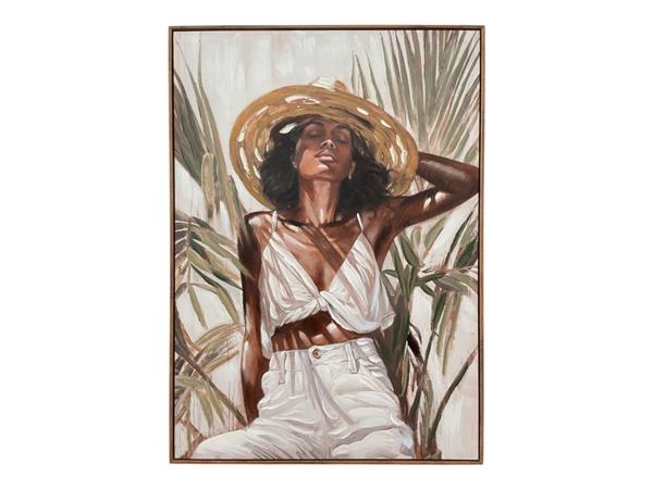 De maat van het Olieverfschilderij vrouw met Hoed 002 is 70 x 100 cm en zit in een baklijst. Afgebeeld is een vrouw met een hoed op omringt door bladeren.