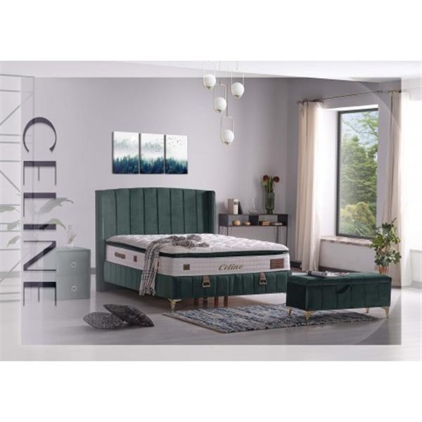 De Boxspring Celine met opbergruimte is een uitstekende keuze voor wie op zoek is naar zowel comfort als praktisch gemak in een slaapoplossing. Deze boxspring is gestoffeerd in een prachtige Doamo Green, die naadloos in elke slaapkamer past en een elegant accent toevoegt. Beschikbaar in diverse maten, waaronder 90×200 cm, 120×200 cm, 140×200 cm, 160×200 cm en 180×200 cm, biedt deze boxspring een passende optie voor iedereen. Vervaardigd uit hoogwaardige materialen, garandeert het een optimale ondersteuning en comfort voor een goede nachtrust.Een van de prominente eigenschappen van de Boxspring Tokio is de handige opbergruimte. Dankzij de handige opberglades aan de zijkanten kun je moeiteloos je slaapkamer opgeruimd en georganiseerd houden, perfect voor het opbergen van beddengoed, dekens, kussens en andere niet-dagelijkse items. Met zijn strakke en moderne ontwerp past deze boxspring moeiteloos bij elke slaapkamerstijl, waardoor het een ideale keuze is voor diegenen die op zoek zijn naar een combinatie van stijl en functionaliteit.Eenvoudig te monteren, wordt het bed geleverd met alle benodigde materialen en duidelijke instructies. De Boxspring Tokio met opbergruimte is geschikt voor zowel kleine als grote slaapkamers, verkrijgbaar in verschillende maten en compatibel met elk interieur. De handige opbergruimte zorgt er bovendien voor dat je slaapkamer altijd opgeruimd en netjes blijft.Kleur: Doamo GreenMatras:Het circa 30 cm dikke matras is uitgerust met een 9-slags pocketvering en afgewerkt met hoogwaardig koudschuim, met daarboven een extra topper en mee gestoffeerd in de luxueuze meubelstof. Dit opbergbed wordt geleverd met één matras dat enkelzijdig beslapen kan worden. Door dit regelmatig te draaien, verleng je de levensduur van het matras.