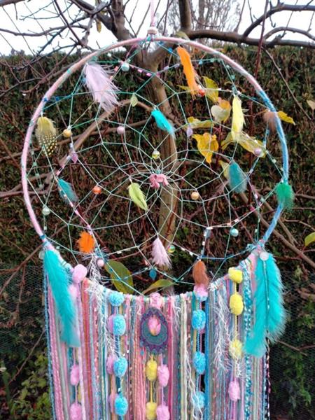 Handgemaakte Dromenvanger of Dreamcatcher in zachte pastel tinten.