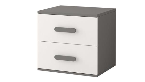 Dit leuke, moderne nachtkastje wordt geleverd in neutraal wit met grijs, waardoor het bij veel van onze bedden past!